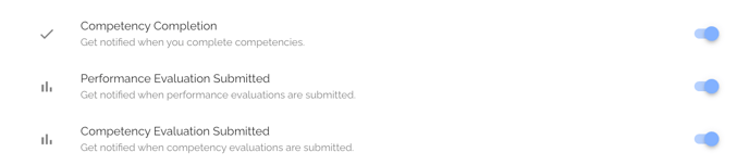 Note: You can receive email and in-platform notifications for the following competency evaluation changes if you have them toggle on (blue) under your Account - My Profile - Settings.