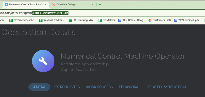 For example, the occupation_id for the occupation Numerical Control Machine Operator in the screenshot below is the last string of highlighted numbers/letters in the URL address. By clicking on an employer in the platform, you would find their employer_ID in the same location.